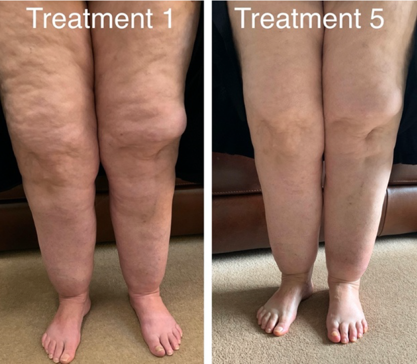 The photo below shows my client who presented with stage one primary bilateral lymphoedema. After 5 weekly treatments the swelling has decreased, and my client says that she “feels lighter”. The treatment is not a cure, but it has helped her take control of the condition; she is now more motivated to continue with her healthy eating, some gentle exercise, self-massage between appointments and more importantly her self-esteem has increased.